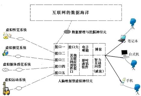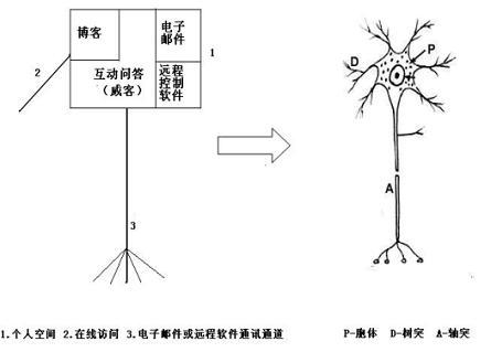 在相關(guān)論文中,我們也繪制了更為詳細(xì)的互聯(lián)網(wǎng)映射型虛擬神經(jīng)元,它是以目前互聯(lián)網(wǎng)個人空間應(yīng)用為基礎(chǔ),擴(kuò)充并預(yù)言了成熟后的互聯(lián)網(wǎng)神經(jīng)元結(jié)構(gòu)。