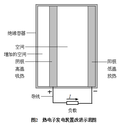 根據(jù)熱電子發(fā)電裝置的結(jié)構(gòu)可知,在陰極溫度、陽(yáng)極溫度不變的情況下,或在陰極與陽(yáng)極之間的溫度差不變的情況下,如果使陰極的左表面與絕緣容器的左內(nèi)表面之間增加一個(gè)空間(見圖2),則陰極的左表面要向增加的空間發(fā)射熱電子,陰極發(fā)射出的熱電子數(shù)要增加,陰極的電勢(shì)要升高,陰極與陽(yáng)極之間的電勢(shì)差要增大,熱電子發(fā)電裝置的輸出功率要增大,熱電轉(zhuǎn)換效率要提高。