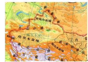 冰輒沉降理論認(rèn)為:山脈的形成并非板塊水平運(yùn)動(dòng)的結(jié)果,而是地殼區(qū)域性沉降而造成的相對(duì)上升,起決定作用的是重力作用下的地殼區(qū)域性沉降,圖2所示是新疆地形圖圖中明顯可以看出地殼垂直運(yùn)動(dòng)的跡象。