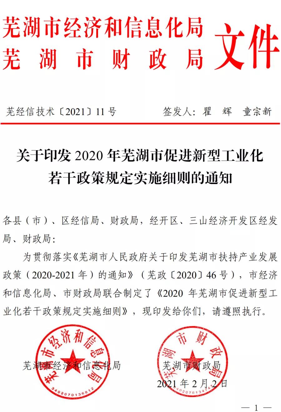 蕪湖市2020年促進(jìn)新型工業(yè)化若干政策規(guī)定實(shí)施細(xì)則印發(fā) 作者: 安徽新天源建設(shè)咨詢有限公司 最后修訂: 2021-02-05 08:59:23 摘要: 附件