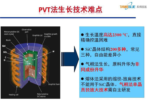 PVT法生長碳化硅存在以下技術(shù)難點,一是晶體生長溫度高達(dá)2300℃,直接精確控溫困難;二是很難獲得單一的碳化硅晶體結(jié)構(gòu);三是生長時原料易升華為非同成份其他物質(zhì);四是熔體法采用的縮徑-放肩技術(shù)不適用于氣相法碳化硅晶體生長,氣相法單晶直徑放大技術(shù)需自主研發(fā)。