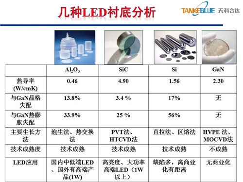 但是在這里面我們今天講的主要是藍(lán)寶石、碳化硅,剛才在講的時候我思考幾個問題,這幾個材料在發(fā)光效率上藍(lán)寶石可以做到150lm/W,碳化硅可以做到200lm/W,在發(fā)光效率上確實體現(xiàn)差異。在物理基礎(chǔ)參數(shù)上體現(xiàn)了差異,比如說跟氮化鎵外延,從晶格匹配上,碳化硅上長氮化鎵確實好一些,藍(lán)寶石失配大一些,直接影響外延的質(zhì)量。另外導(dǎo)電性、熱導(dǎo)率也是有差異的。
