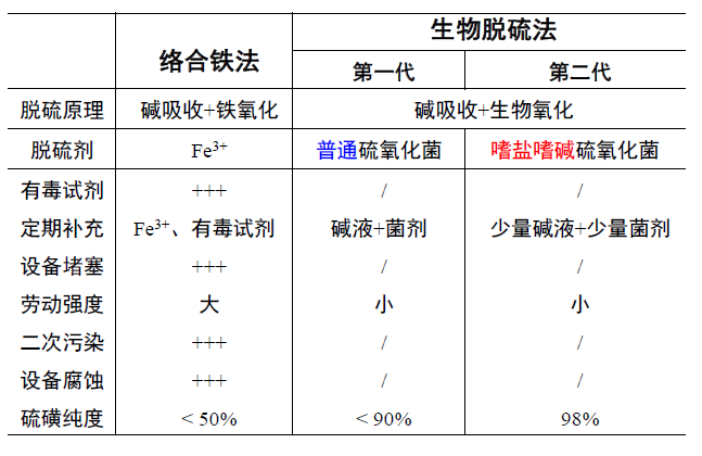 經(jīng)過中試連續(xù)運行我們發(fā)現(xiàn)嗜鹽嗜堿硫氧化脫硫體系相比傳統(tǒng)絡(luò)合鐵法具有明顯的優(yōu)勢:極端微生物可耐受的環(huán)境優(yōu)勢更為突出,僅需定期補充堿液及少量菌劑就可保證整個系統(tǒng)連續(xù)運轉(zhuǎn),勞動強度小,且系統(tǒng)回收單質(zhì)硫磺的純度高達98%。更多內(nèi)容見下表。