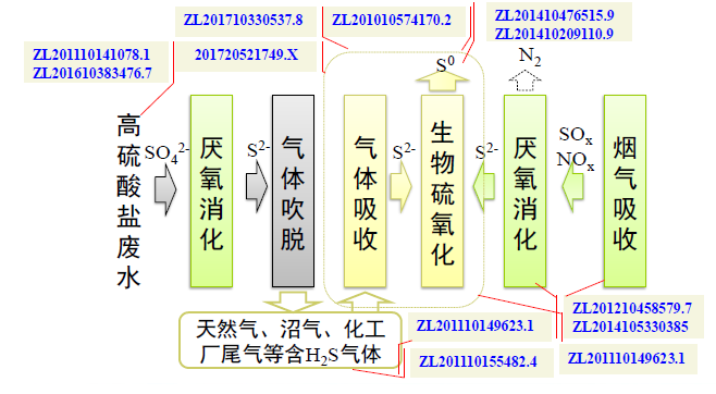 基于嗜鹽嗜堿硫氧化菌開發(fā)氣體生物脫硫及硫回收工藝,我們將其在高硫酸鹽廢水和煙氣脫硫脫硝中進行應(yīng)用,并對關(guān)鍵流程的知識產(chǎn)權(quán)進行了全面布局(圖1-8)。