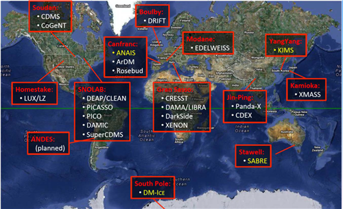 圖4 全世界暗物質(zhì)地下實(shí)驗(yàn)分布(暗物質(zhì)直接探測)