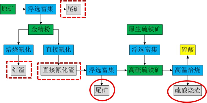 黃金生產(chǎn)過程的固廢包括浮選尾礦、氰化渣(紅渣和直接氰化渣)(圖3)??蓪鹁V的浮選尾礦進(jìn)行氰化提金或制造建材,對直接氰化渣進(jìn)行浮選回收有價元素。