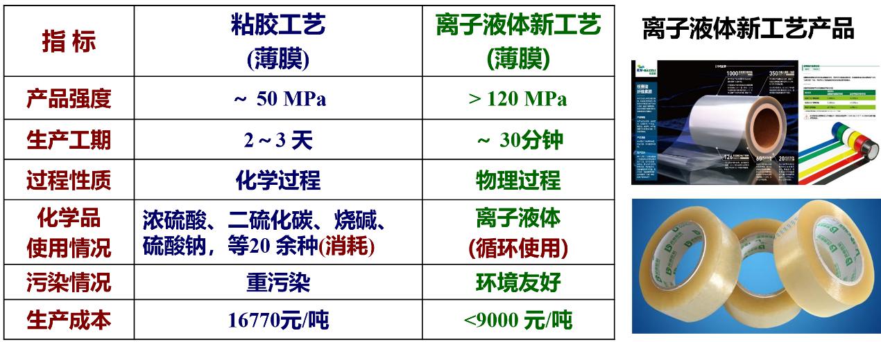 圖8 纖維素膜的傳統(tǒng)粘膠工藝與離子液體新工藝指標(biāo)對(duì)比